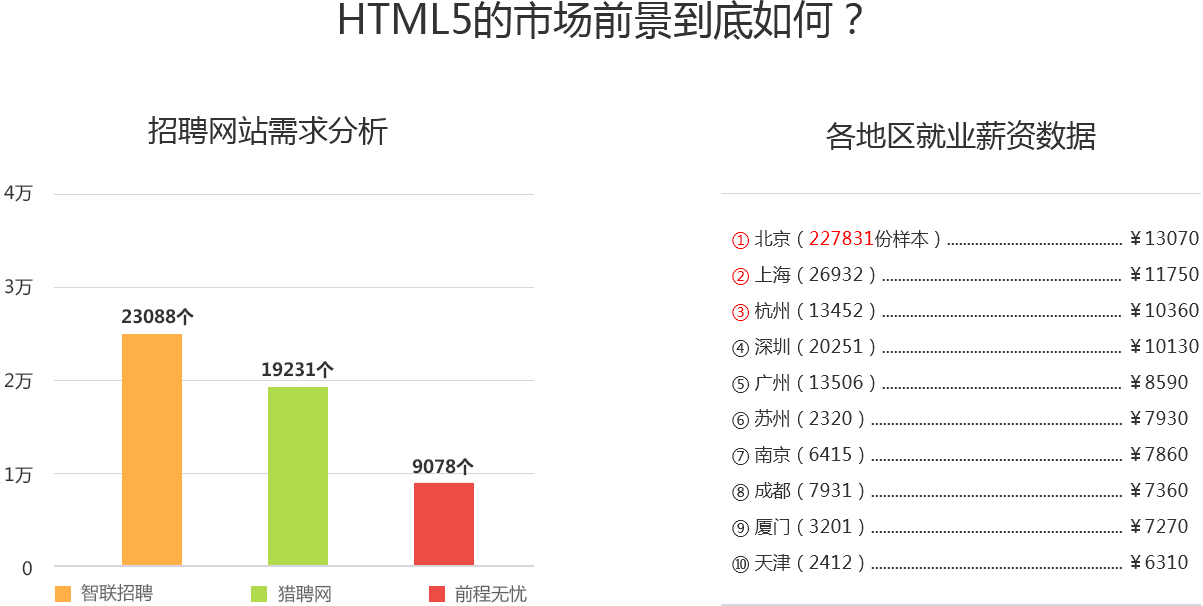 ——HTML5開發(fā)人員職業(yè)規(guī)劃與薪資待遇—— 據(jù)統(tǒng)計(jì),我國(guó)對(duì)于高級(jí)HTML5開發(fā)人員的缺口將達(dá)到12萬(wàn)左右。目前,北京、上海、廣州、深圳等地HTML5開發(fā)人員的薪資待遇更是一高再高。